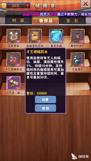 商业街售卖着多种能提升艺人属性值的药水,像才艺增幅药水、超常增幅药水等。一旦购买并使用,艺人对应的属性值便会在短时间内得到提升,而且这种提升效果还能维持一小段时间,这对于参加重要比赛来说,时间完全足够。