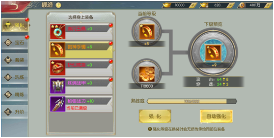 强化等级越高,消耗铜钱越多;铜钱主要通过日常和仙帝宝库获得