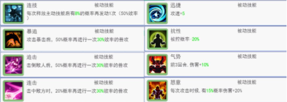 激昂战意(12级):每有敌方单位阵亡时,自身伤害+18. 6%,暴击率+9. 3%,可叠加10次 且不可清除