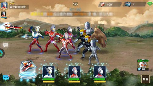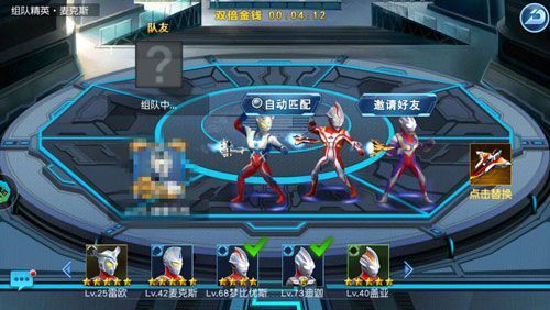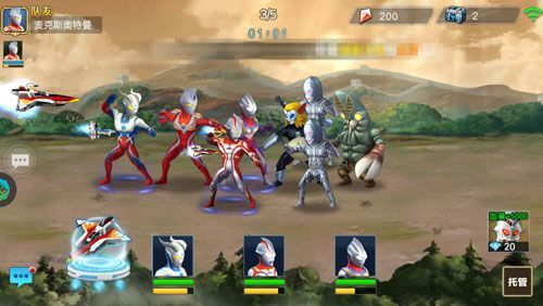 组队界面先说明一下,这里系统提供的助战不再是和第二章一样的会加血会回能量的高斯了哦,而变成了麦克斯,所以玩家就要注意一下技能释放的时机,避免血量过少而导致奥特曼阵亡了,实在不行也可以点一下奥特之王的头像,花费20钻石恢复全体5000的血量。