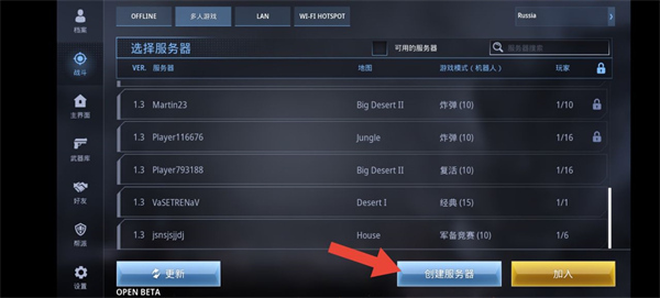 1、在战斗界面点击创建服务器选项。