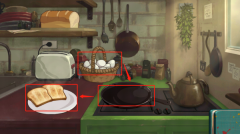 9、点击面包,将面包片拖至面包机,再将烤好的面包拖至盘子中