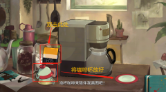 13、冲泡一杯咖啡,首先把咖啡杯摆放妥当,接着双击并移动咖啡杯至咖啡机处,然后将咖啡倒入咖啡杯之中。