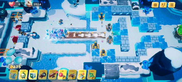 1、开局8到10秒后,冰雪机器人先放在右边,搞个弓箭塔,然后路中间放弹簧,升级箭塔。