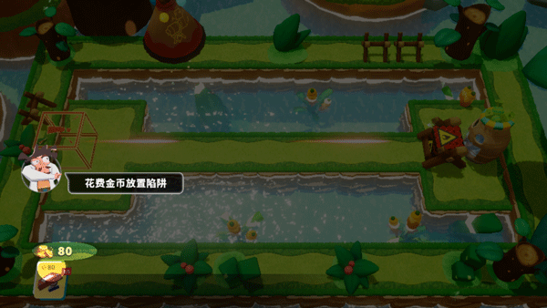 6、将金币拖到路上,布置陷阱,将野人弹到河里去
