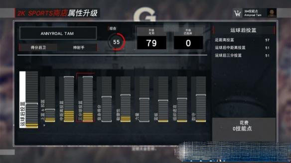 完成赛事可以获得技能点,然后前往商店用技能点进行属性升级。属性分为跳投好手、内线得分、运动健将、进攻组织、篮板王子、防守铁闸。