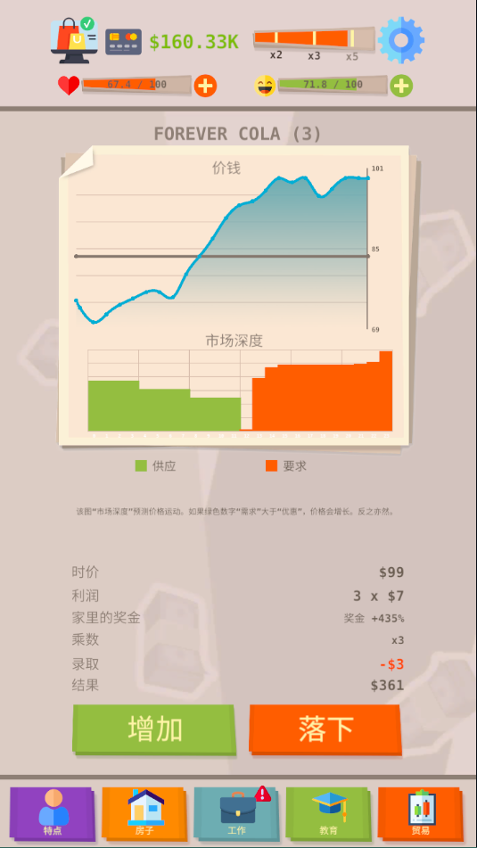 在成功人生模拟器游戏里,获取的技能助力你步入成年人的小康生活。你可以挑选最有意思的工作,一步步提升职业阶梯,实现买房买车的目标,还能与女孩外出游玩,赚取丰厚财富。尤为关键的是,借助技术指标(诸如价格、趋势、供求量等)对金融事件与市场状况展开分析,以此学习股票投资,并在证券交易所进行交易。