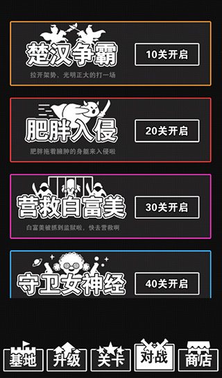 不仅如此,为提升游戏可玩性,汉字攻防战为玩家准备了多种特色玩法,像楚汉争霸、肥胖入侵、营救白富美等。这些玩法需玩家挑战对应关卡方可开启。总体而言,该游戏在玩法与创意方面都十分新颖,感兴趣的朋友不妨下载体验一番。