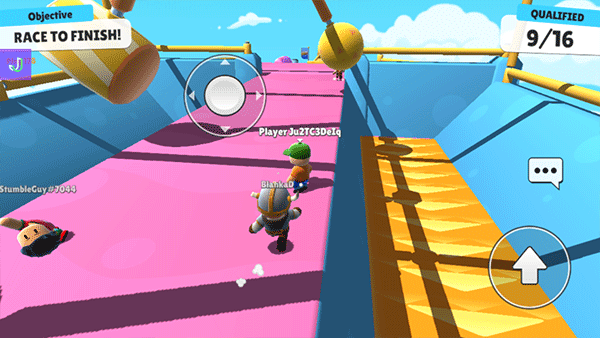 8、在游戏中,玩家依靠虚拟按键来操控人物移动。右侧按键,单击实现“跳跃”动作,双击则触发“向前扑”的操作。玩家需依次通过三轮障碍赛道(即地图)。每一轮比赛结束时,凡是成功抵达终点线或者顺利越过障碍的玩家,都能晋级到下一轮,如此循环,直至最终冠军产生……