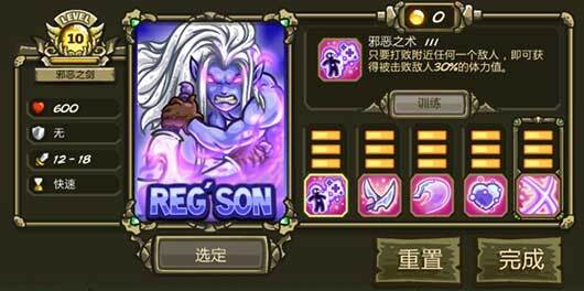 这家伙定位十分清晰,妥妥的刺客,有着“十步杀一人,千里不留行”的风范。普通攻击的伤害不算高,而且只能进行近战,然而其攻击速度却是所有英雄中最快的,这很好地弥补了他攻击力不足的状况。可惜除了大招外,无法攻击空中目标,算是个小小的遗憾,不过范围伤害(aoe伤害)还算过得去。大招更是具备秒杀能力,堪称3代英雄里最为厉害的秒杀技能,其他英雄根本无法与之相提并论。拥有此技能,注定雷吉森的与众不同。在前期,这家伙的输出并不显眼,毕竟怪物血量不高。但到了后期,大招瞬间就能将他的总输出提升至顶尖水平,许多玩家就是冲着这个大招来尝试玩他的。我刚开始玩的时候,第二个选择的英雄便是他。
