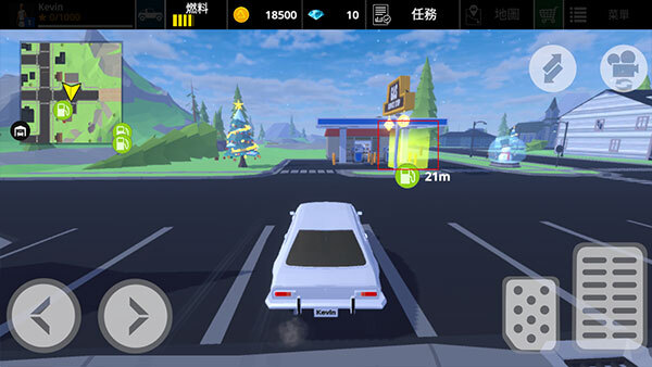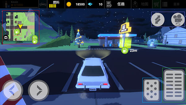 4、通过左上角的地图,查看加油站在地图中的位置。左侧箭头用于控制汽车行驶方向,右上方的双向箭头能够挪动车辆,摄像头可切换开车视角,右侧则分别是刹车和油门。