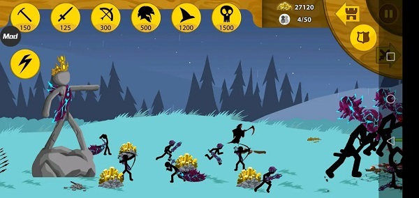 《火柴人战争:遗产》是一款颇为经典的对战塔防游戏。进入游戏,首要任务便是获取资源。只需点击屏幕左上角的“锄头”按钮,就能召唤出负责挖矿的火柴人。这些火柴人会拖着大包去挖掘矿石,如此一来,我们便能获取更多矿石,进而召唤出战斗类的火柴人。