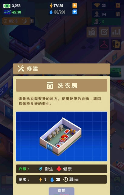 3、升级囚犯的淋浴间,监狱院子,开辟新部门,增加牢房模块,改善探视室和食堂。负责水和电的供应,使您的监狱更舒适。