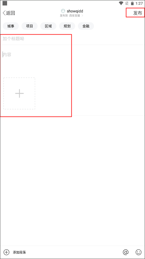 3、为自己的帖子取一个标题,详细填写关于城市的建议内容,上传与之对应的照片,最后点击右上角的发布按钮就行。