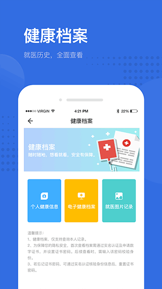 健康服务涵盖:健康档案的查询与维护、健康管家服务、电子健康卡相关功能,以及科普资讯等内容。