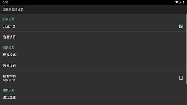 3、音频设置主要涉及声音、帧率以及游戏加速等方面的设定。