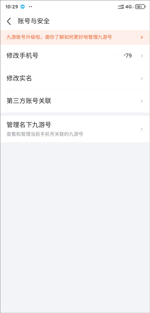 3、进入“账号与安全”,这里具备修改手机号、修改实名、账号关联等功能。点击“管理名下九游号”,便能查看并管理当前手机号所关联的九游号。