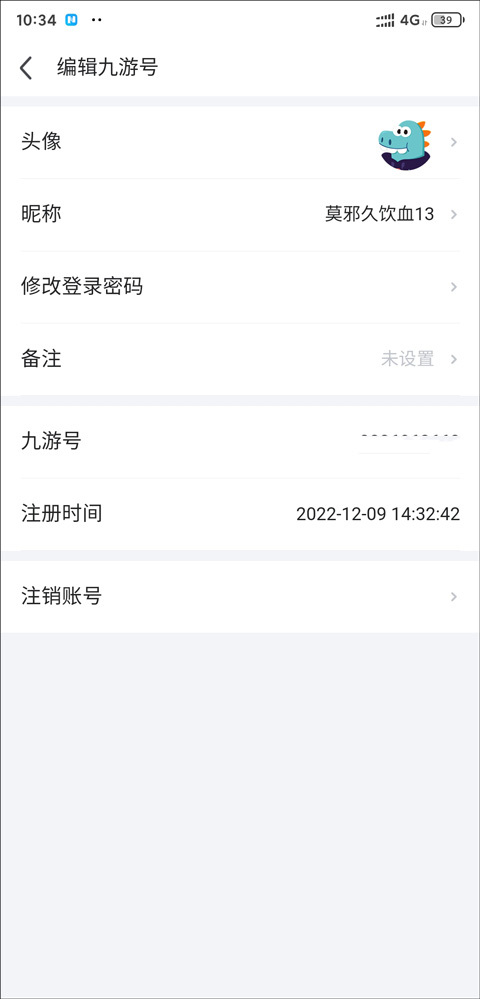 4、点击关联的九游号打开,可以查看头像、昵称、登录密码、九游号等数据
