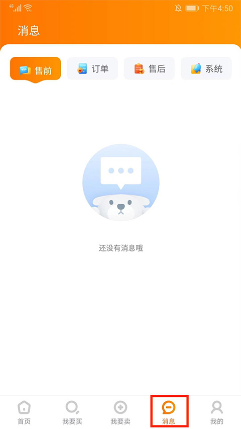 5、在【消息】界面,可以查看售前、订单、售后和系统的消息,了解最新动态,