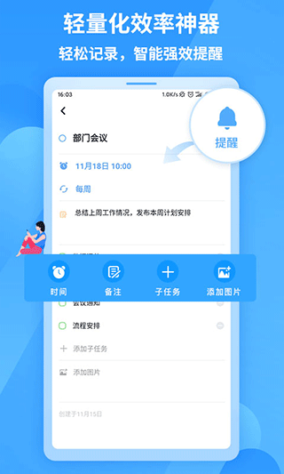 2、对包括子任务、图片、备注以及自定义重复提醒等细节内容进行详细记录。
