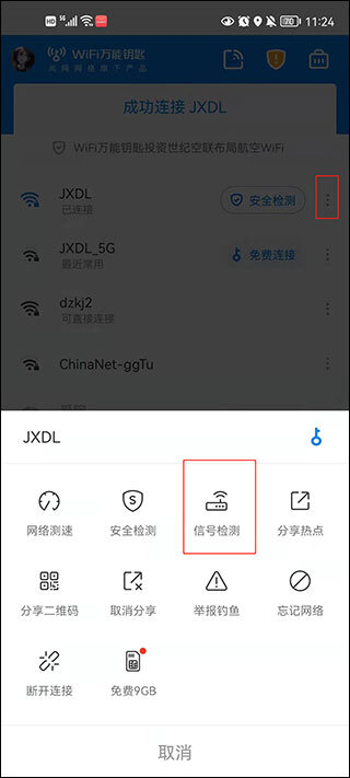 1、点击我们正在使用的wifi热点右侧三个点图标,下一步就可以对它进行一个信号检测了。