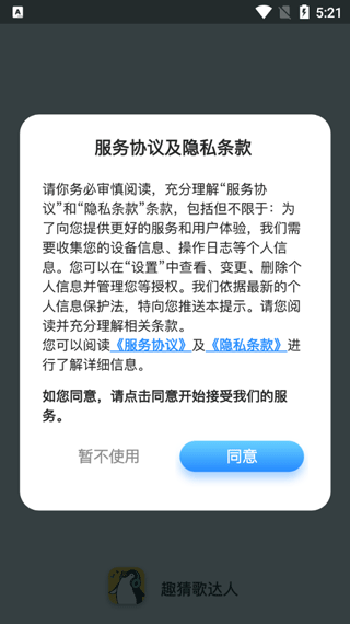 1、第一步,打开猜歌达人红包版2024最新版本,点击同意用户协议。