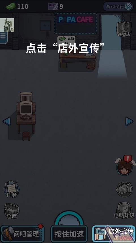 游戏刚开始时,会有详尽的新手引导。当你熟悉了网吧经营的基础玩法后,接下来就需要着手进行引流操作。引流的方式是,点击右下角的“店外宣传”。