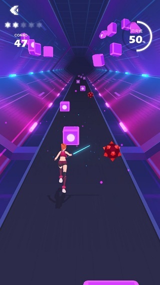 2、在动感音乐的伴随下,长按屏幕并左右移动游戏里的小人,让小人用手中光剑切开飞速袭来的方块!记得要躲开所有障碍哟~