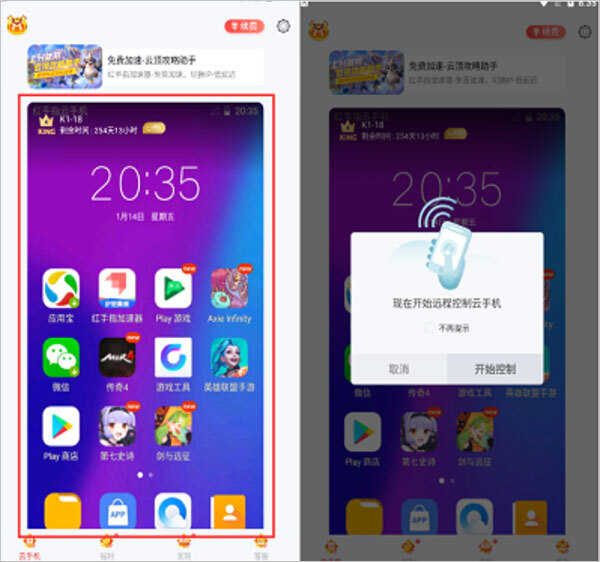 1. 打开从本站下载并安装好的红手指云手机app,点击云手机预览界面,此时会弹出远程控制云手机的提示,点击“开始控制”,即可进入虚拟云手机桌面。