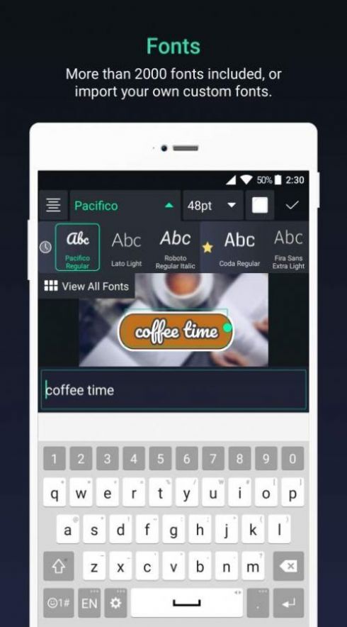 6、【精选文字】100+精心设计的字体和丰富的文字编辑功能。