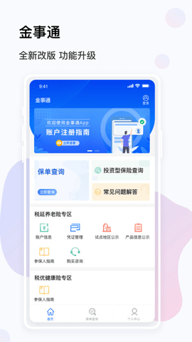3. 有保单查询、投资型保险查询、常见问题解答,还有税延养老险专区、税优健康险专区等。2、用户登录后可查询保单、查看税延养老险账户、下载税延养老险凭证等,