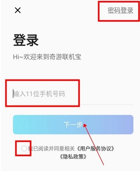 3.软件提供了账号密码和验证码登录等两种方式,此处以【验证码登录】为例,如需切换登录方式,点击右上角【密码登录】即可。输入到手机号码并勾线下方的协议之后即可点击【下一步】按钮。