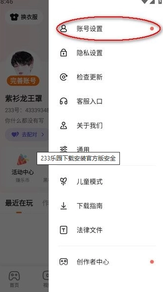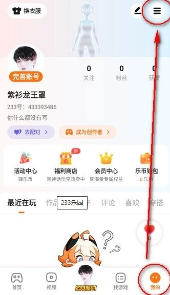 1. 开启233乐园,轻点右下角“我的”,接着点击左上角的三条杠。