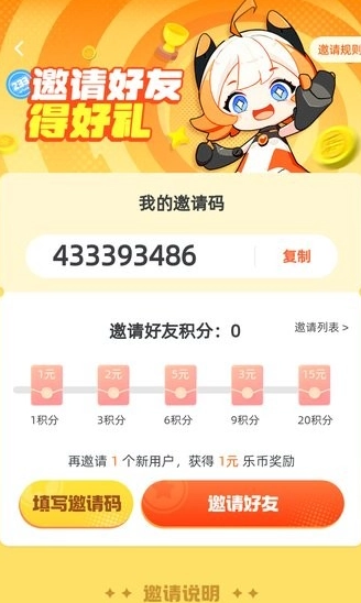 3、邀请好友,得好礼;把邀请码分享给好友,每一个新用户都可以获得乐币和积分