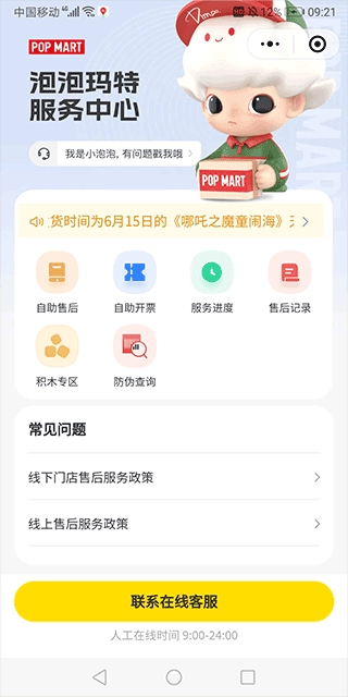 2、然后打开客服小程序进行登录联系泡泡玛特的客服,客服将会询问您退货的原因和商品情况,并确认是否符合退货条件。