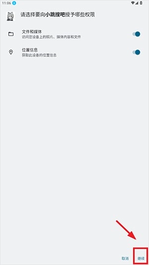 1. 点开小跳搜吧,接着点击继续开启相应权限。