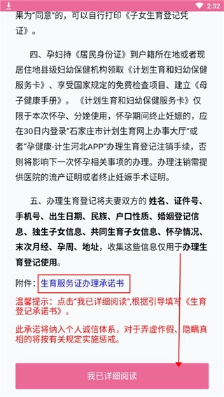 4、阅读相关事项,阅读到底后选择【生育登记承诺书】点击即可。打印后如实填写签字,然后点击下方的【我已详细阅读】。