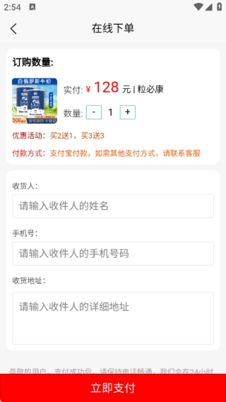 3、进入在线下单页面中选择数量、输入收货人、电话以及收货地址,然后点击立即支付;