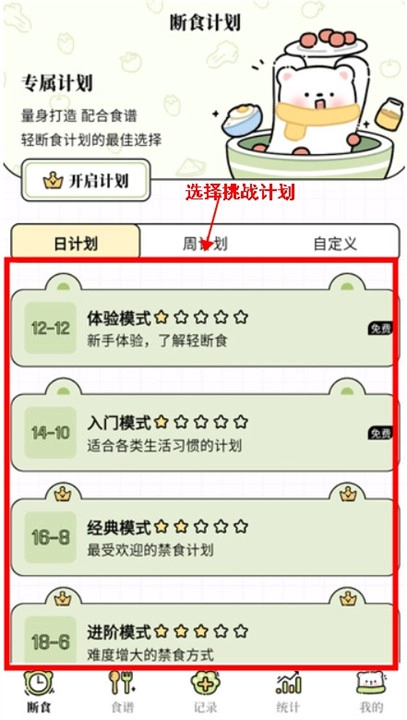 2、接着进入到断食板块中选择相应的挑战计划