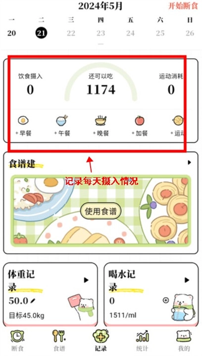 4、用户点击记录还能够快速对每天的摄入情况进行记录。