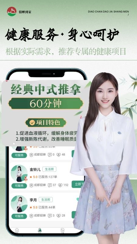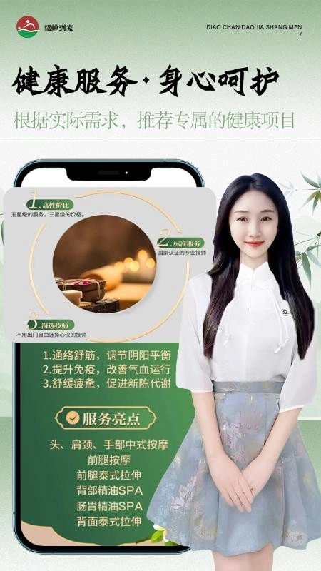 貂蝉到家,这是一款聚焦上门到家按摩预约以及沉浸式养生服务的应用软件。软件内包含众多精心挑选的推拿按摩服务项目,所有养生项目资源都清晰明码标价,大家能够依据自身需求,选择相应的到家养生服务。而且,平台上所有的到家技师都经过实名制认证与专业技能认证,让大家安心在线呼叫按摩与推拿到家服务。不仅如此,貂蝉到家手机版软件每日都会更新新的优惠项目活动,大家可以领取更多折扣与优惠。对这款软件感兴趣的朋友可别错过,快来本站体验一番。
