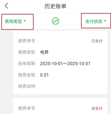 3. 点击页面左上角的“费用类型”,从中挑选需要缴纳的费用;在页面右上角的“支付状态”处,选择“未支付”,进而对未缴纳的费用进行缴纳操作。