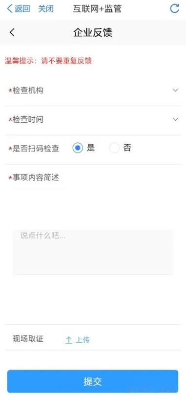 对执法人员检查不规范的,企业可在线进行监督反馈。点击“我的”进入“我要反馈”界面,点击“执法行为反馈”对行政执法部门和执法人员不规范执法行为进行监督反馈。