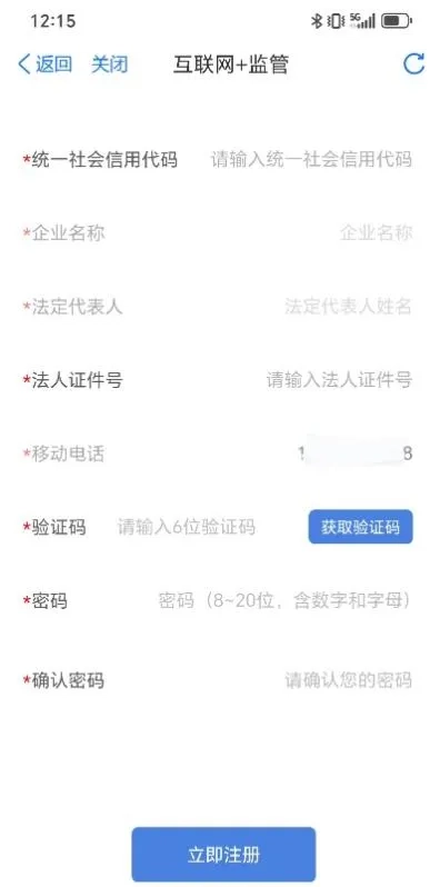 输入企业的“统一社会信用代码”,系统会自动带出“企业名称”和“法定代表人”。输入在登记机关登记的法定代表人的“证件号”,获取手机验证码后,设置“登录密码”,点击“立即注册”完成企业账号的绑定。