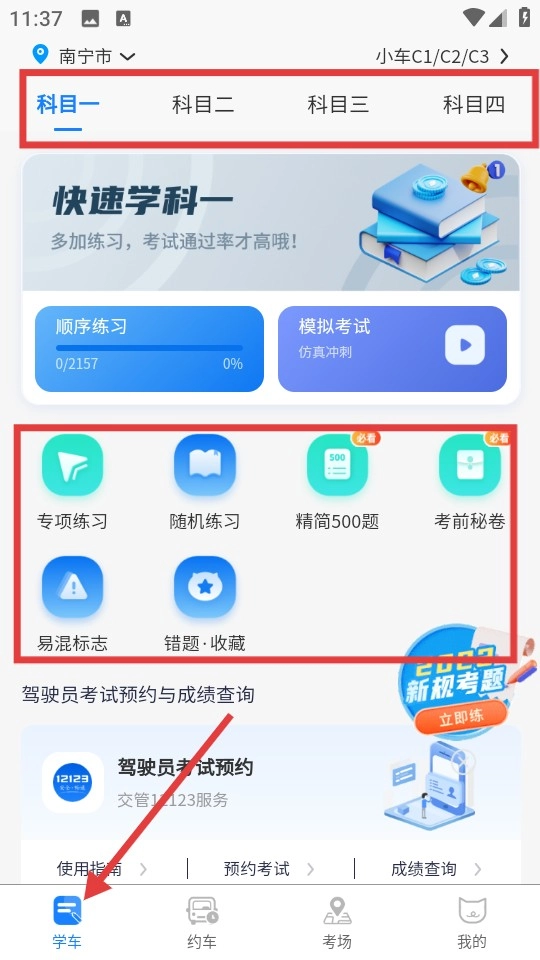 2、进入驾校猫手机版学车板块界面,呈现科目一至科目四分类,有顺序练习、模拟考试等功能,还有专项练习、易错标志等辅助学习入口,下方还关联考试预约等服务。