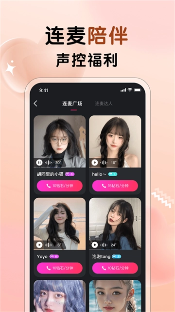 1、连麦广场:在这里能够实现连麦广场连麦,用户资源丰富,只要支付对应的钻石,就能和心仪的对象开启连麦。