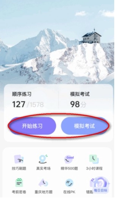 2、打开应用后,进入首页可选择“开始答题”或“模拟考试”,根据自身学习进度自由选择