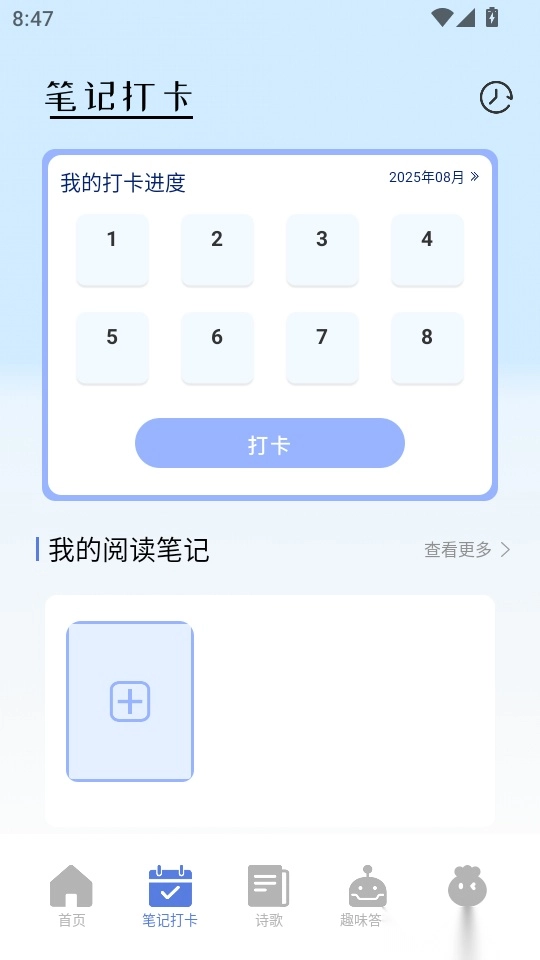 并且,该平台还配备了其他阅读工具,诗歌阅读、笔记打卡、趣味答题等内容应有尽有。