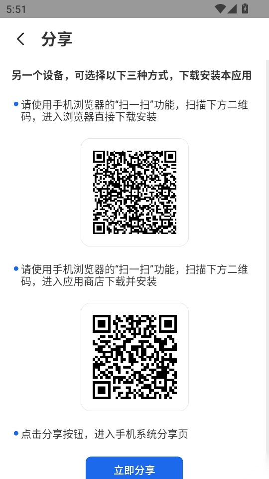 5.如此用户就可以通过二维码方式和点击“立即分享”按钮进行应用分享了