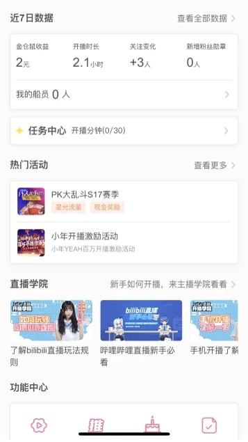 主要突出主播收益数据,其次是热门活动、直播学院等